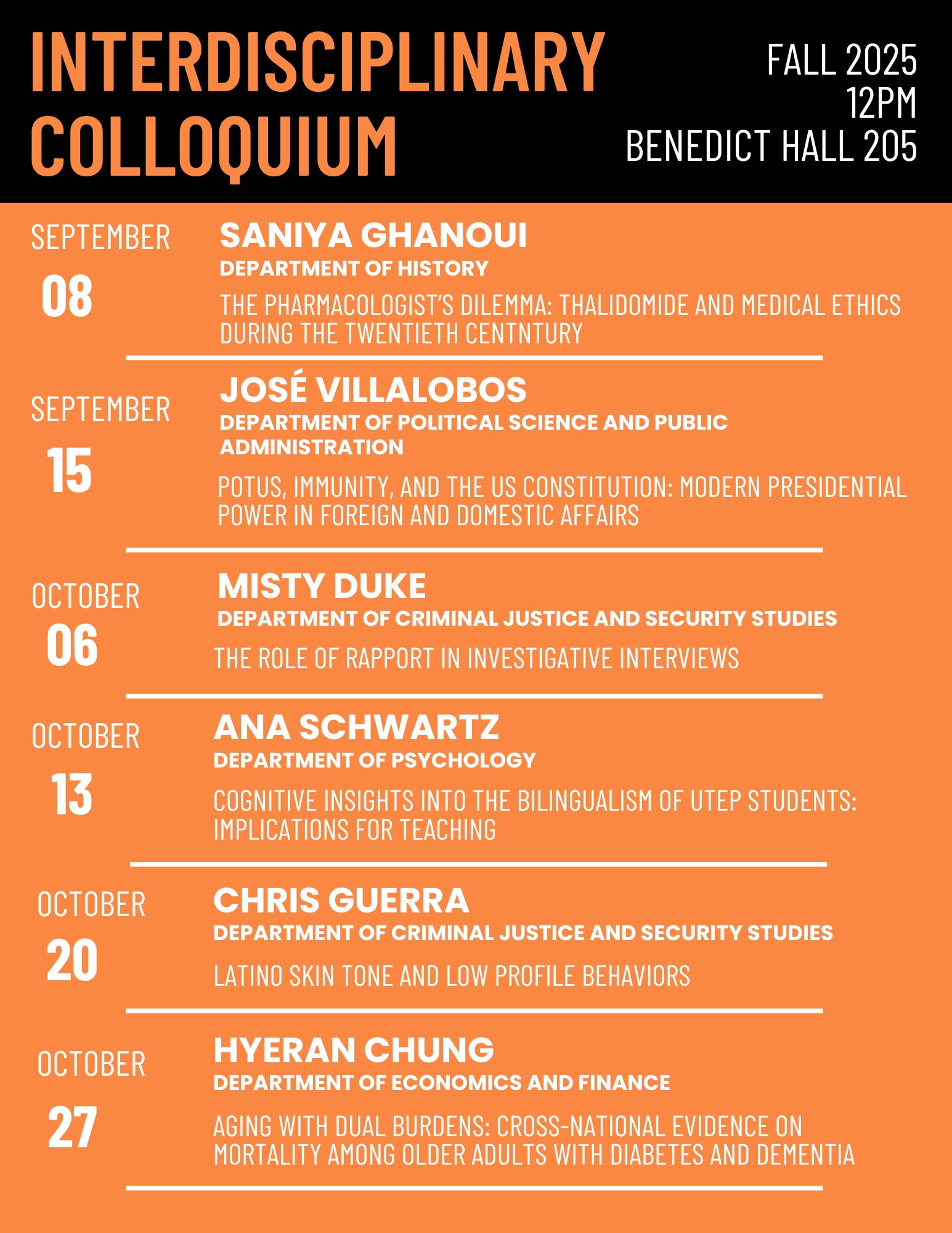 Research talk from Chris Guerra (Criminal Justice and Security Studies) on Monday, October 20th at 12pm in Benedict Hall 205. Title: Latino Skin Tone and Low Profile Behaviors.